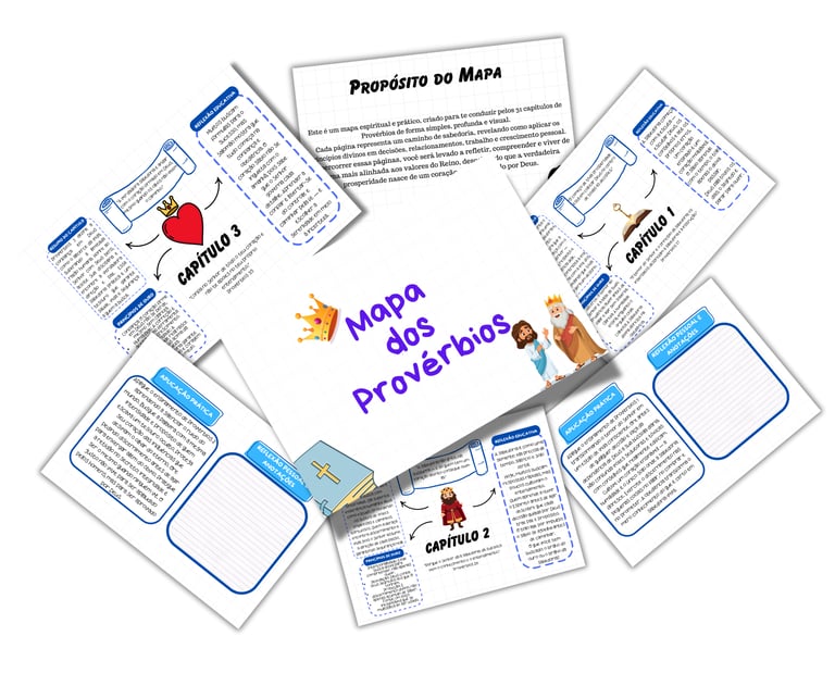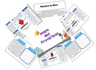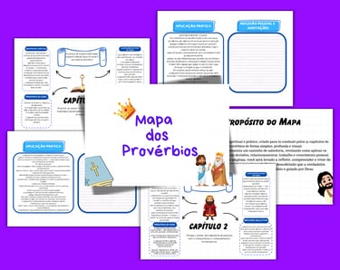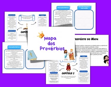 O Mapa dos Provérbios complementa o estudo com resumos visuais de cada capítulo, destacando os principais ensinamentos, princípios de ouro, aplicações práticas e reflexões educativas, tornando o aprendizado mais organizado e acessível.
